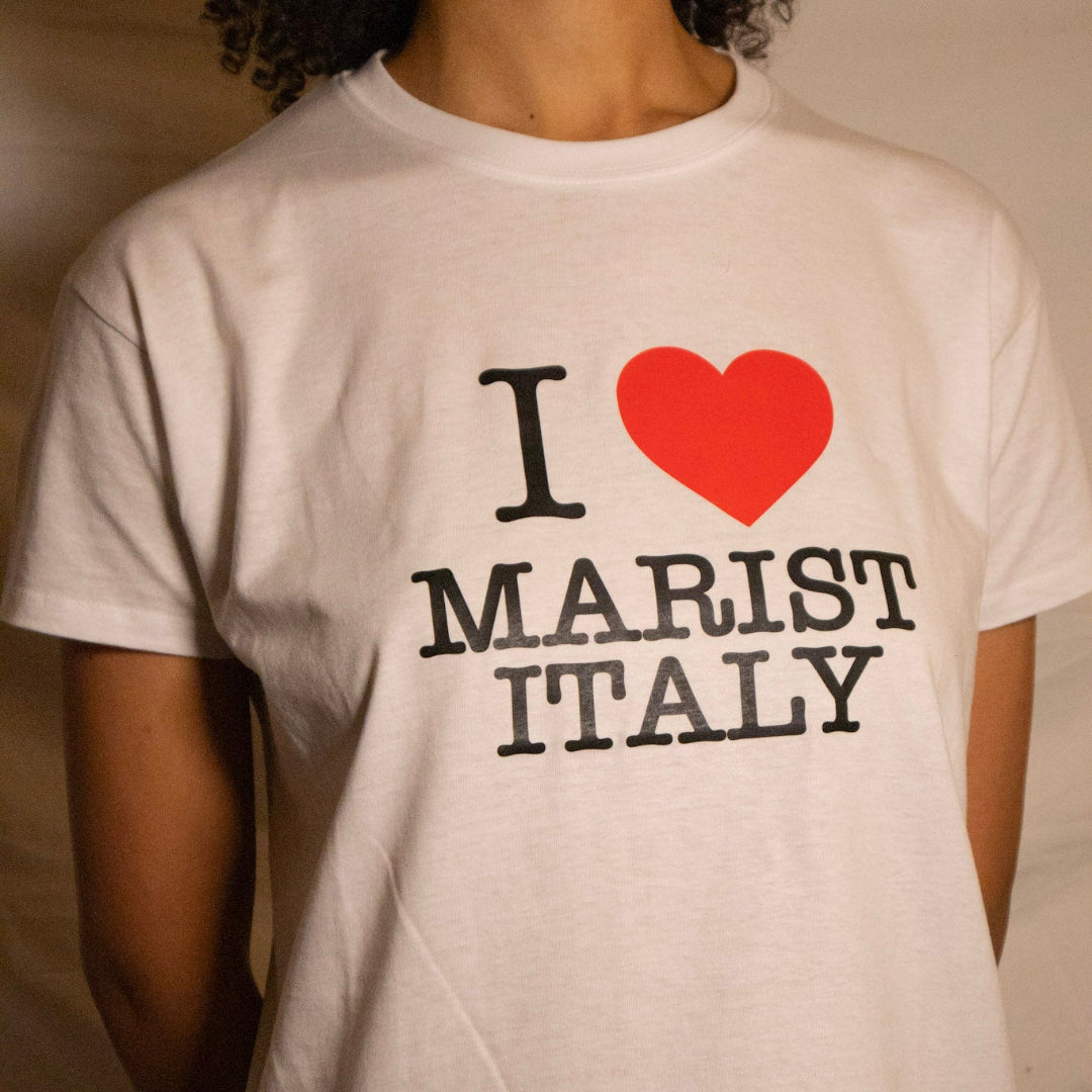Inspired by the souvenir shirts lining the streets of Florence, the I Heart Marist Italy Baby Tee makes for the perfect keepsake. It features a black and red graphic, that is a take on the classic I heart merch, on white t-shirt.